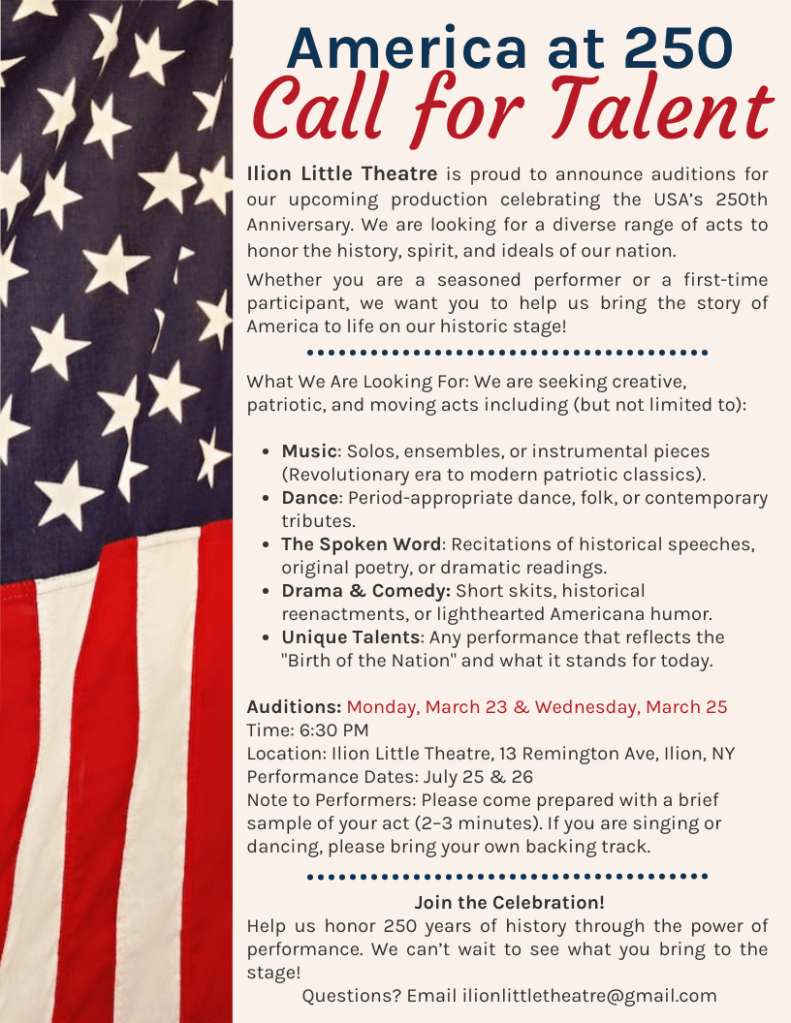 The Ilion Little Theater will hold auditions Monday, March 23 at 6:30 p.m. and Wednesday, March 25 at 6:30 p.m. for an upcoming production celebrating the 250th Anniversary of the United States of America.
